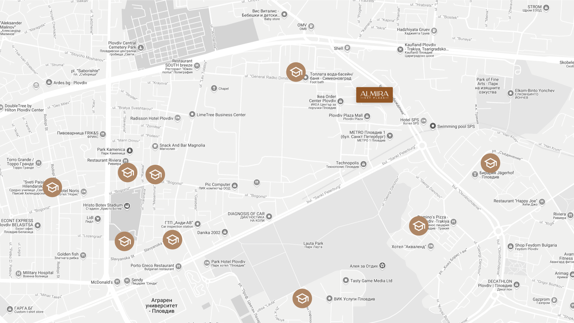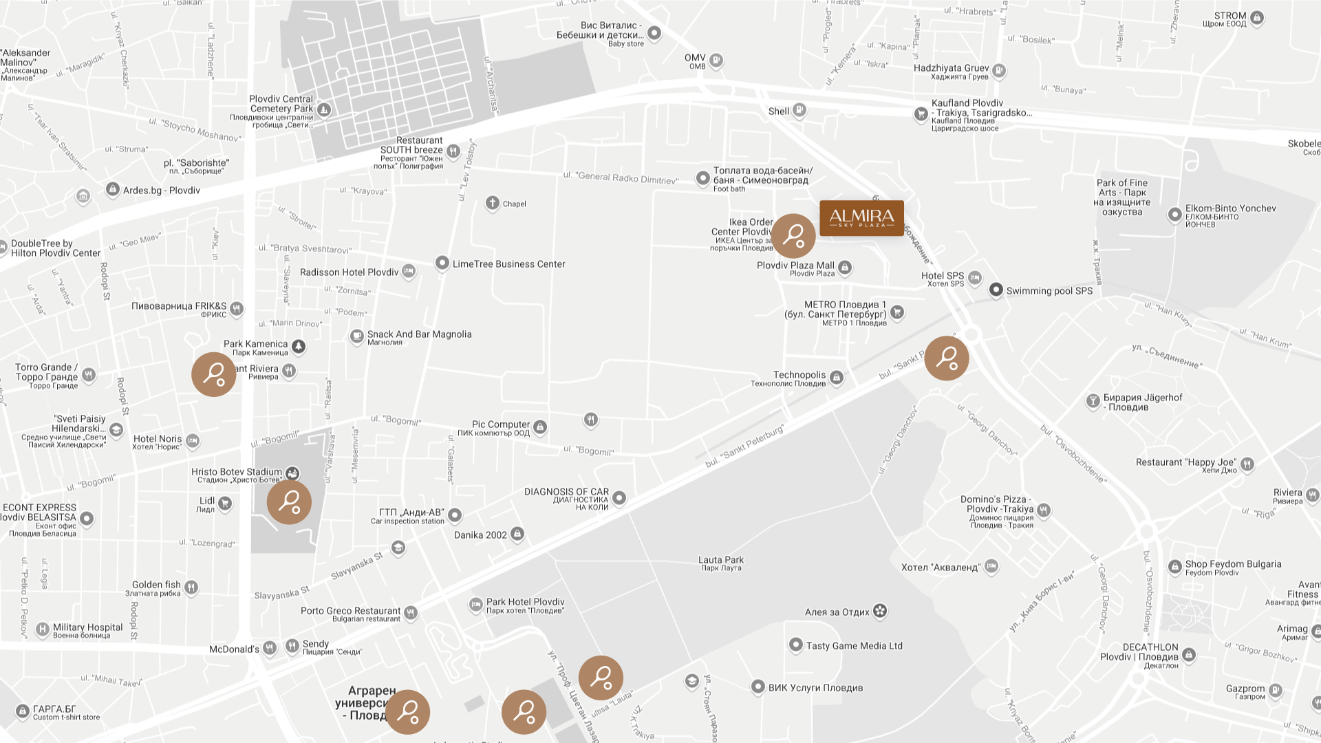В непосредствена близост до Almira Sky Plaza се намира модерният търговски център Plovdiv Plaza Mall. Със своята богата селекция от съвременни магазини, бутици, ресторанти и кафенета, той предлага удобство и възможности за всеки ден.